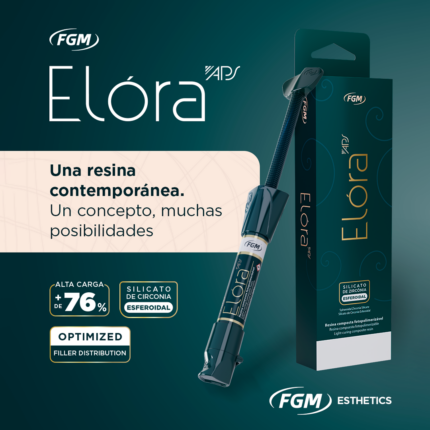 Elóra APS es un composite radiopaco, que reúne una composición monomérica de alto rendimiento y una nueva combinación de cargas, con una amplia distribución de tamaños formando la tecnología Optimized Filler Distribution.