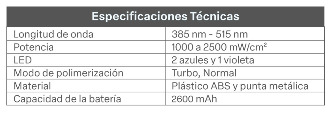 - Tres modos de polimerización (Potencia Estándar, Alta Potencia Plus y Potencia Xtra) se adaptan a sus preferencias.